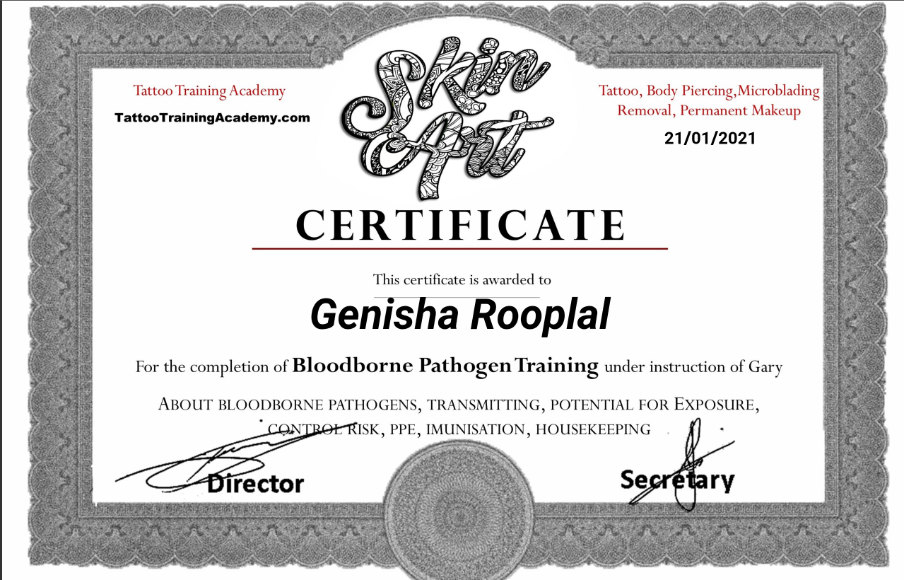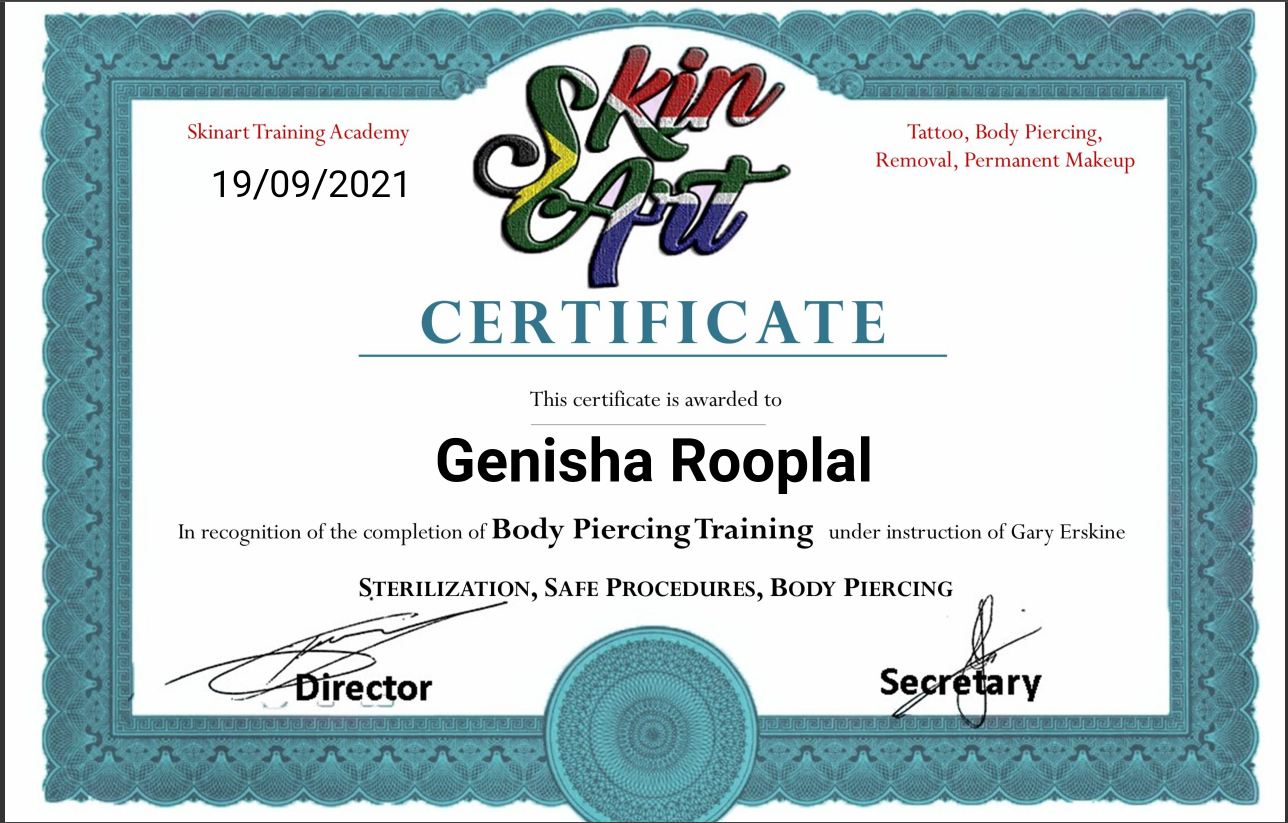 Below are the official certificates authorizing our artist to perform professional body piercing.